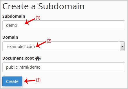 3. En el campo Subdominio , ingrese el nombre de su subdominio, como demo . Seleccione el dominio apropiado de la lista desplegable si tiene varios dominios.